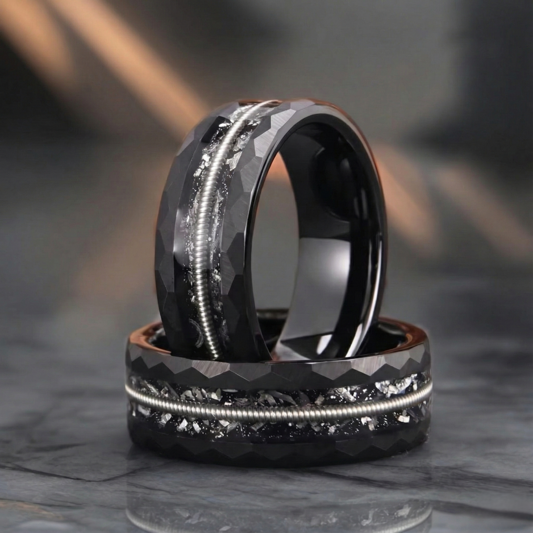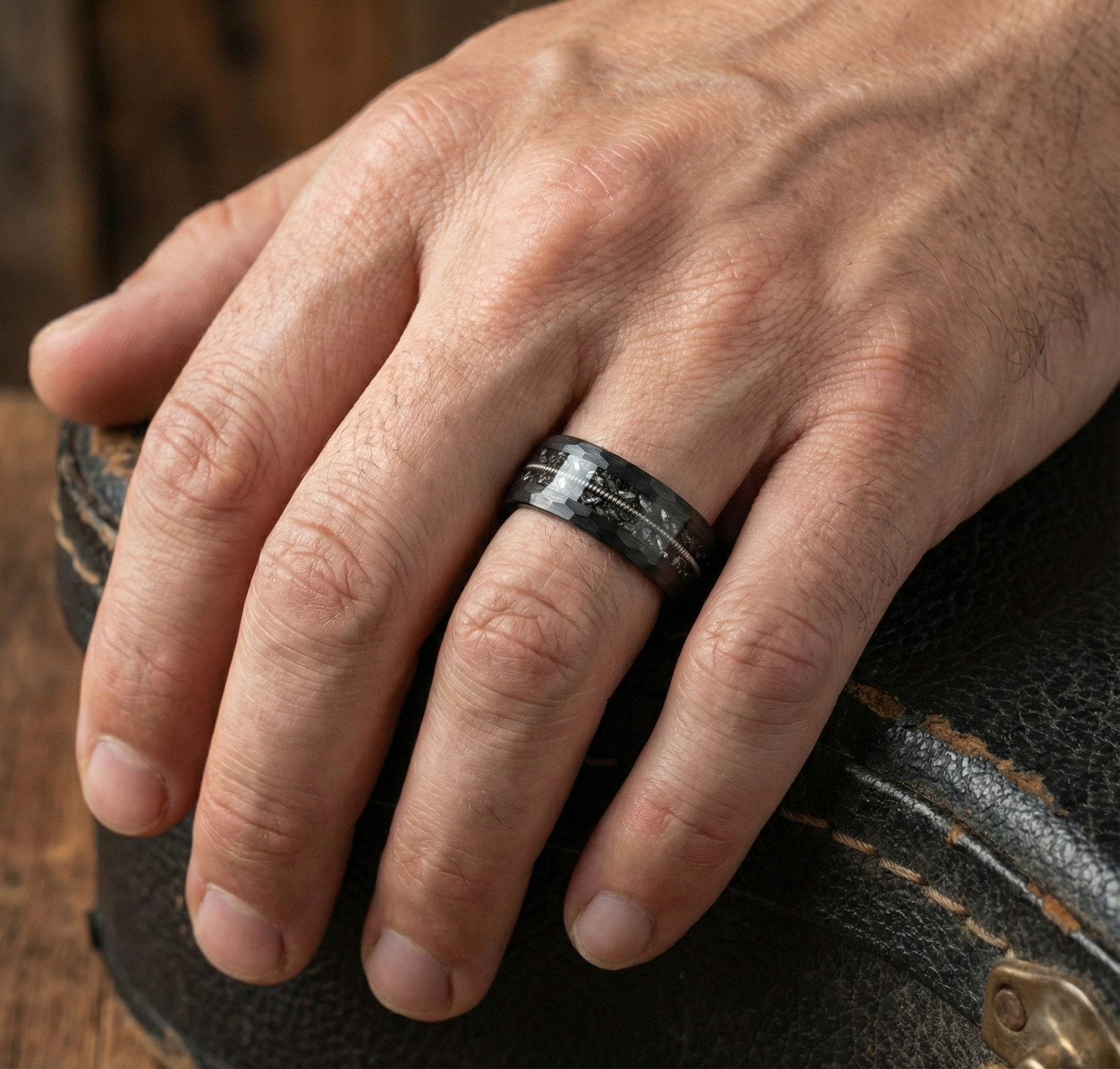 Hammered Black Tungsten Ring and Guitar String Inlay