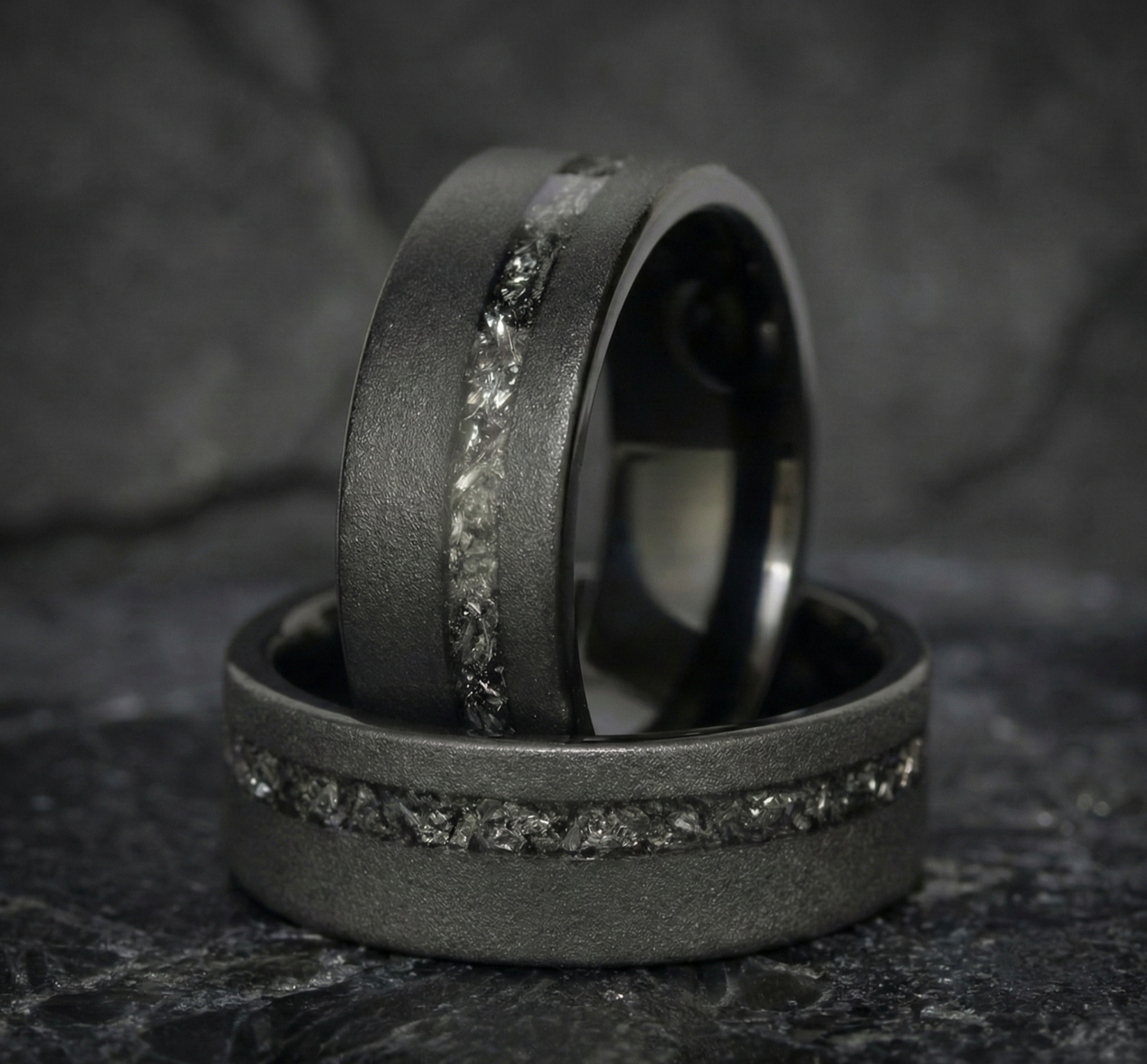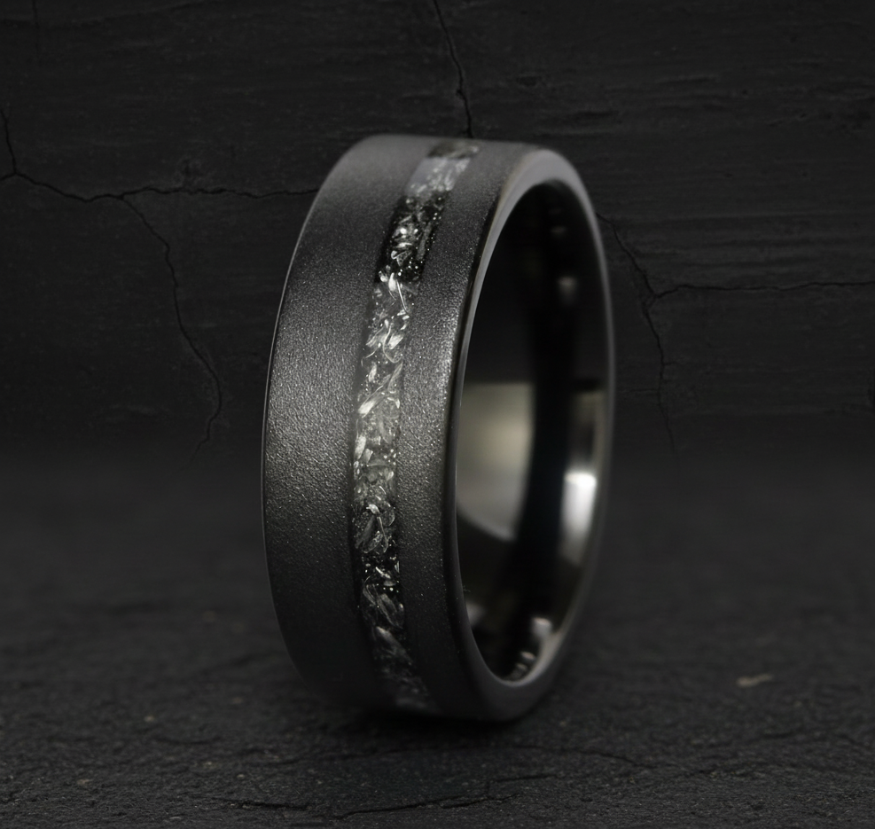 • Real Gibeon Meteorite Debris and Black Sand Star Inlaid Sandblasted Black Tungsten Ring